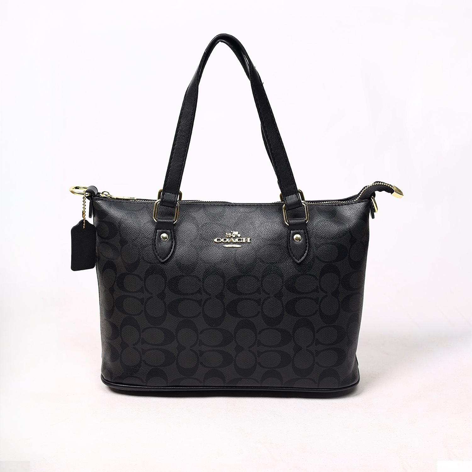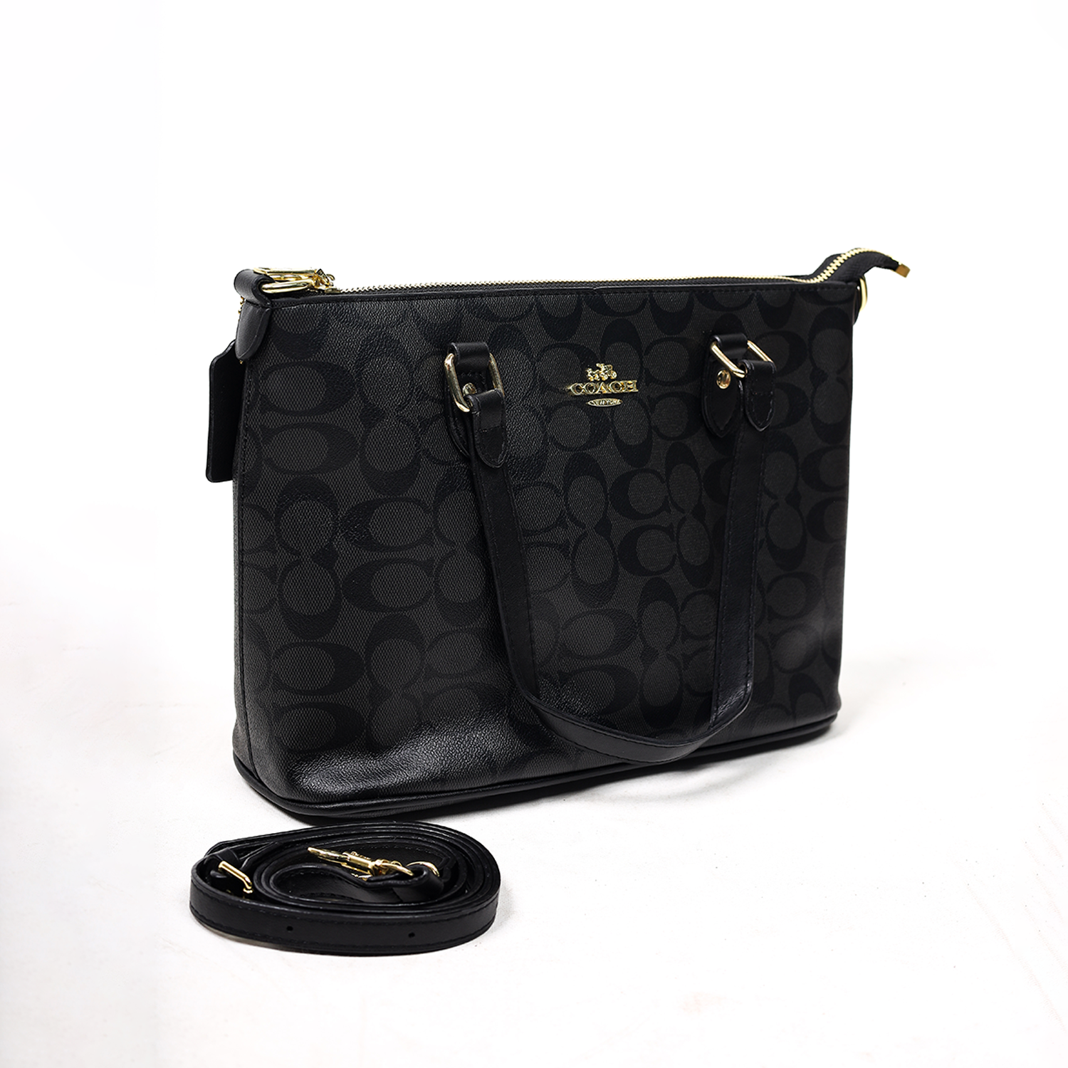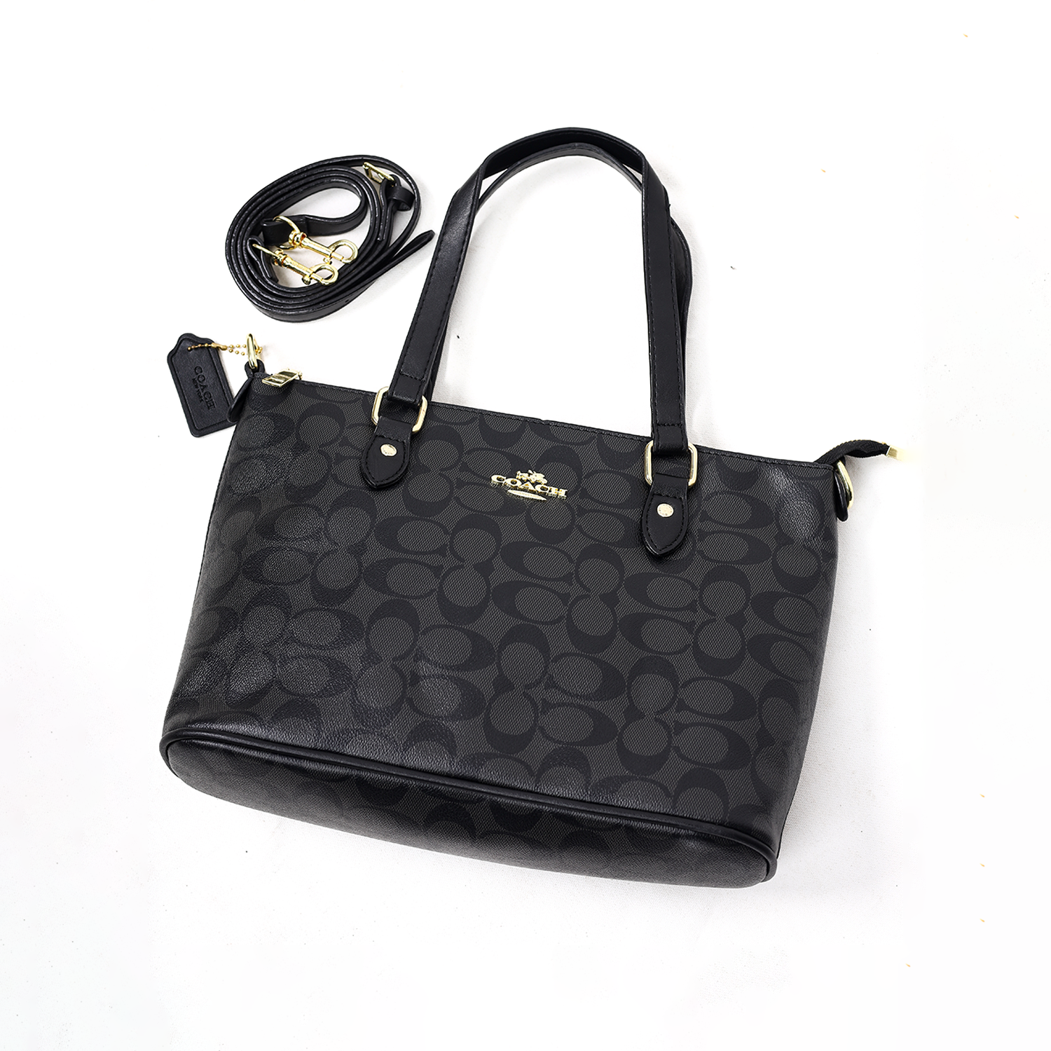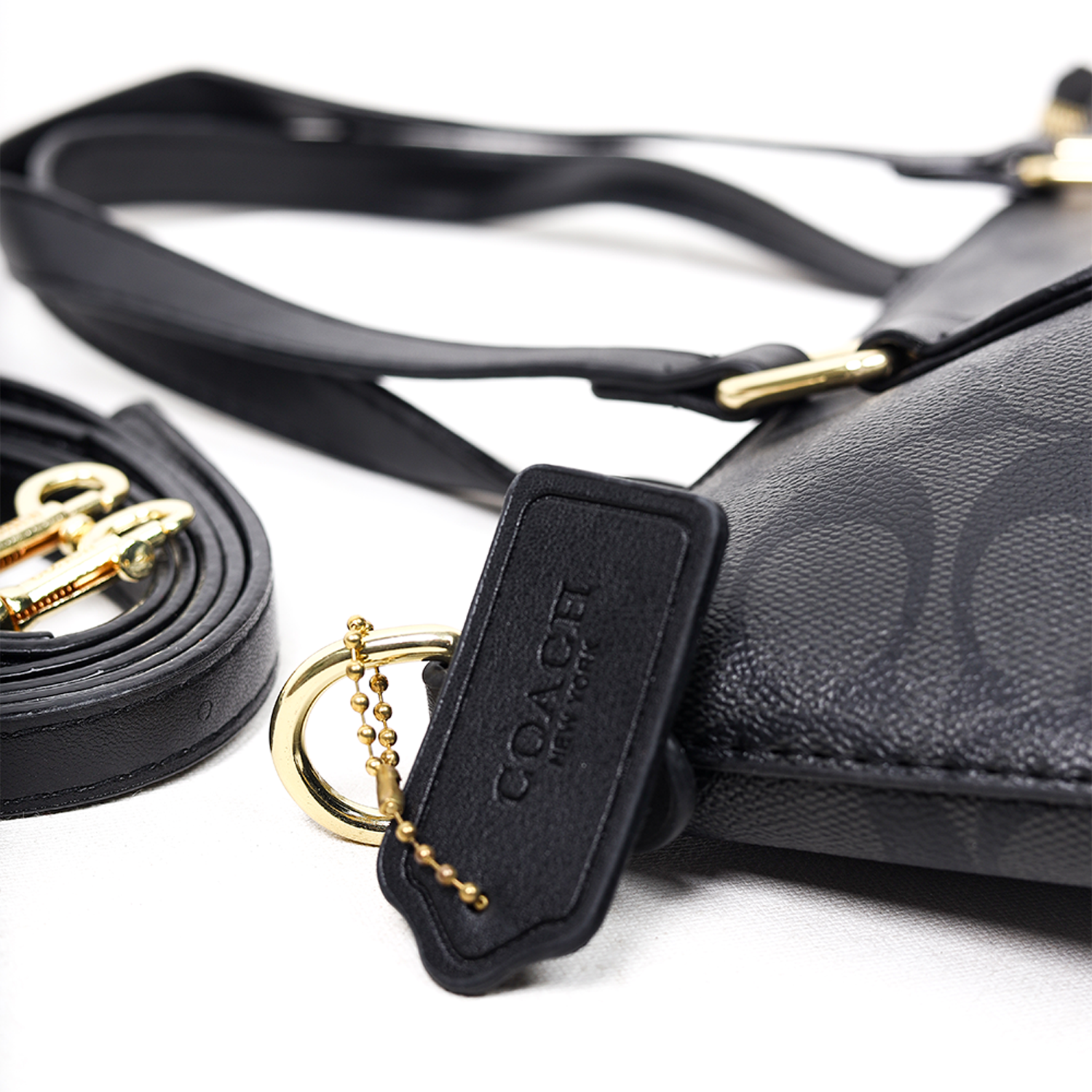 Exterior: Sleek monogram canvas with metallic Coach logo detail